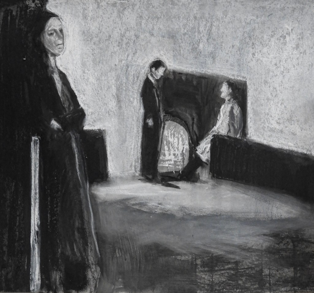- I devised a method for the longer poses to place emphasis on storytelling and composition. Using movie stills from mainly Film Noir – the aim of which use these as a reference for a ‘stage setting’ guiding the positioning of models and providing a light scheme in lieu of interesting shapes and lighting on the studio. These proxemics can then be coopted to drawing the figure in life room; moving her around to occupy the approoximate location of the figures in the image. Feedback was that this really helped to build story and structure into the process and locating the figure in a context. I would like to develop this process at future sessions using a projector as part of the mise-en-scene. The model could be placed in front of the projection and in addition various images can be used to create a composite image.