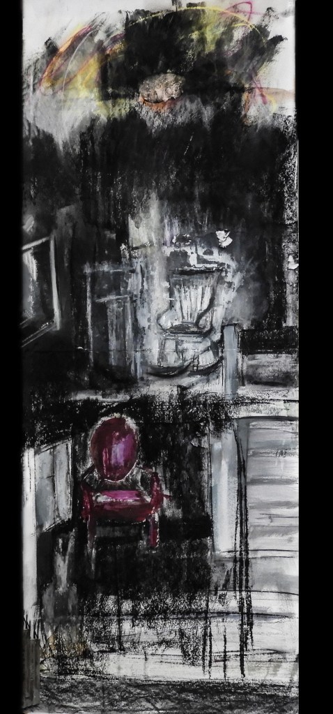These are far looser than the oil-based images, freer in terms of mark-making, more fugitive and evocative, more atmospheric. What is it about my use of oil that makes it too ‘tangible’, too present? Am I using too much paint or not enough paint? Even the charcoal drawings that are dense, dark, and more solid in terms of application (see below), seem more fugitive, oddly suggesting an alternative dimension.