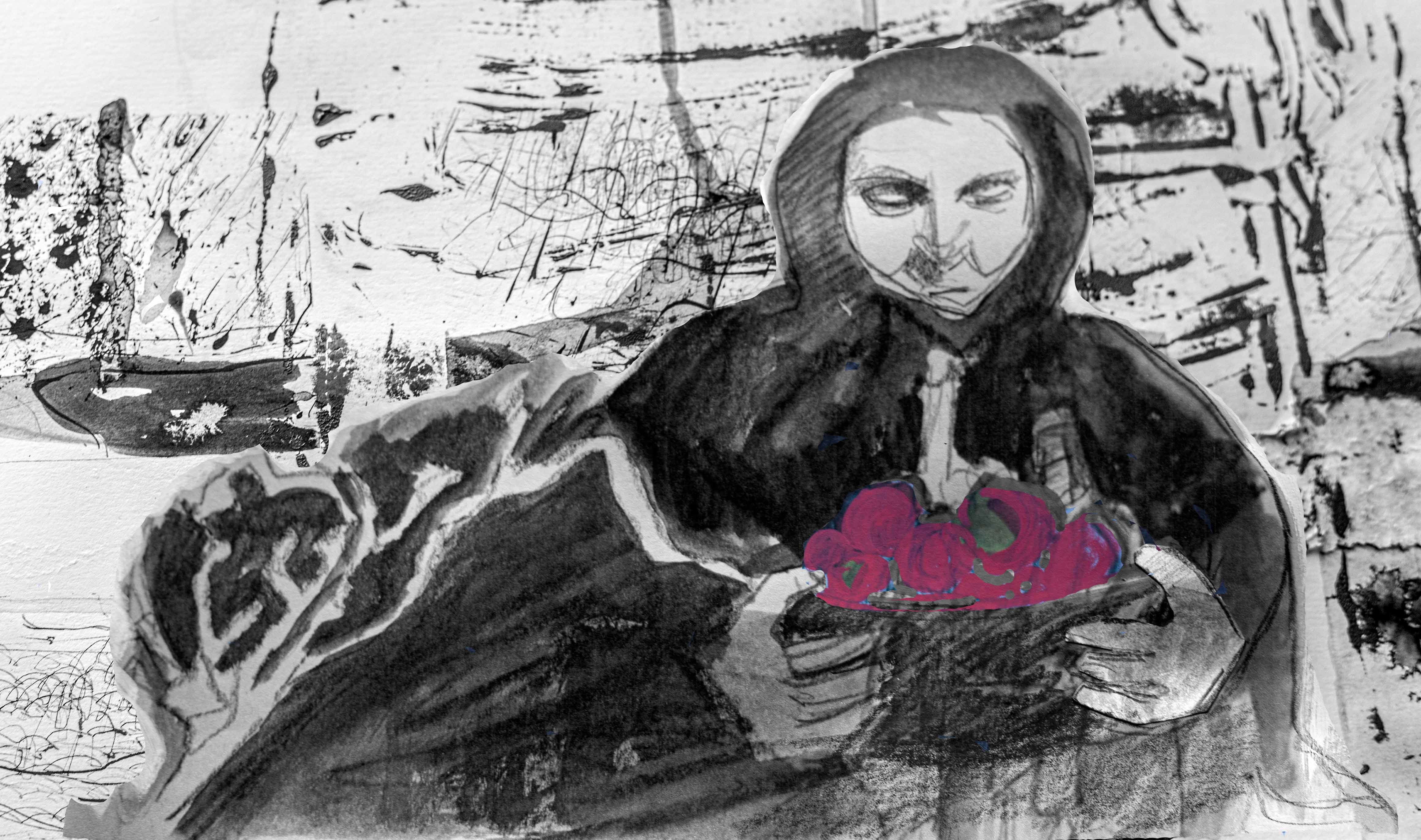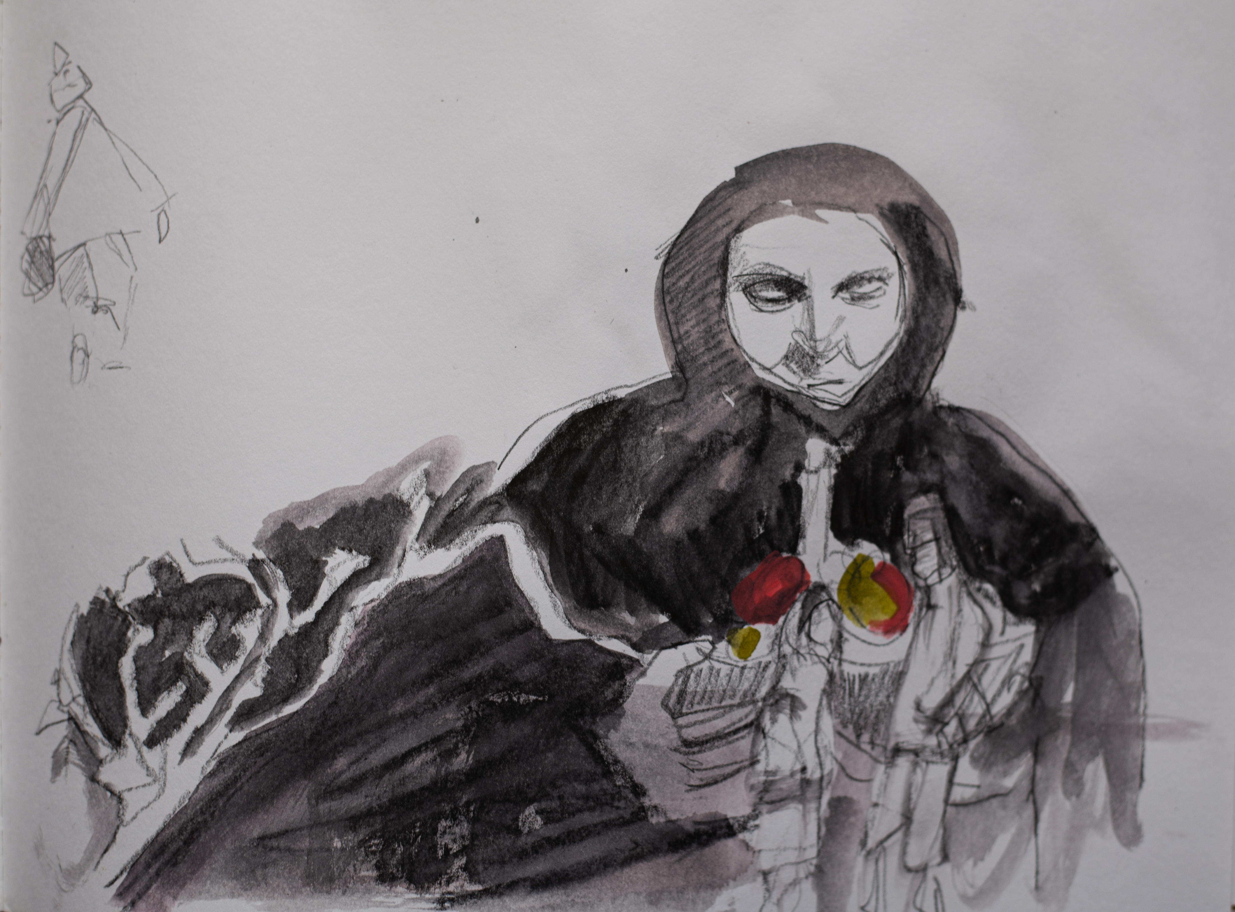 As a result of working in a confined area (unable to go to the studio because of fierce winds). I did some drawing from film, using immediate methods (ie charcoal, watercolour etc).