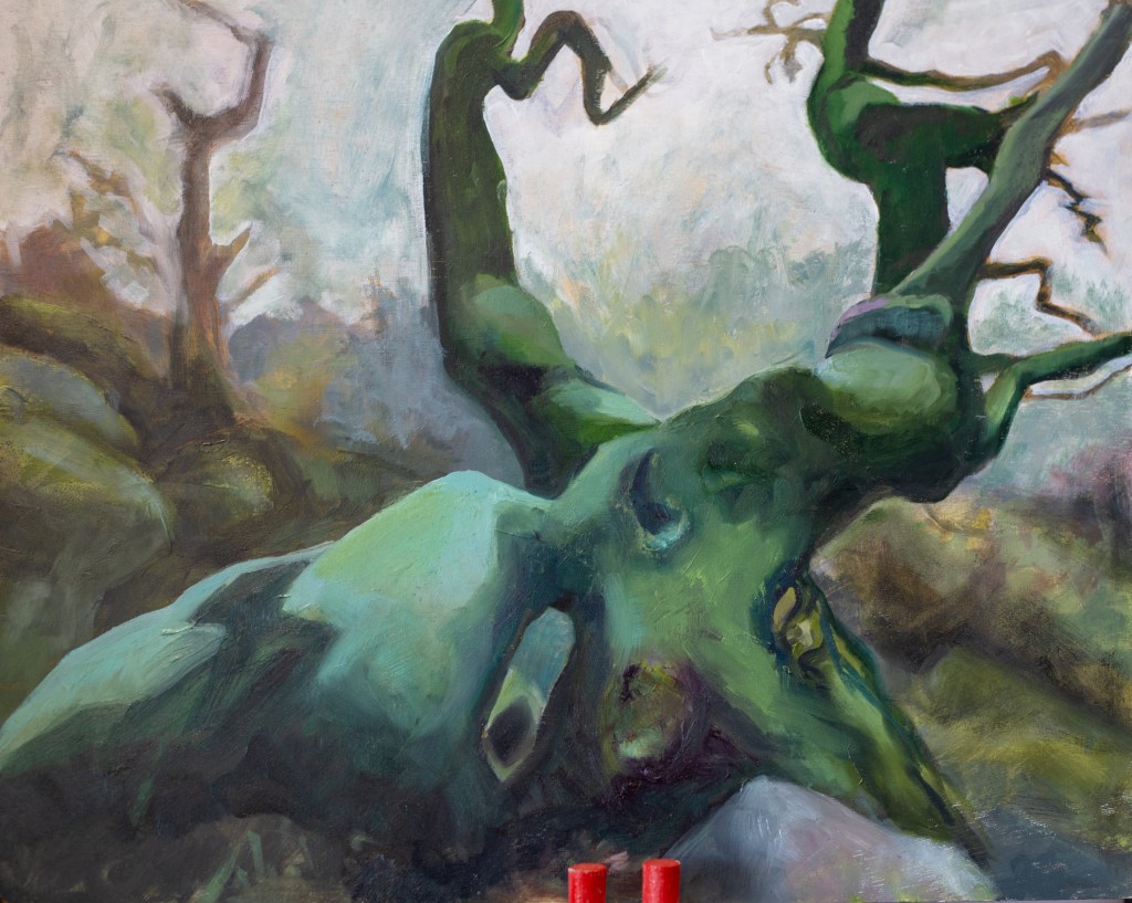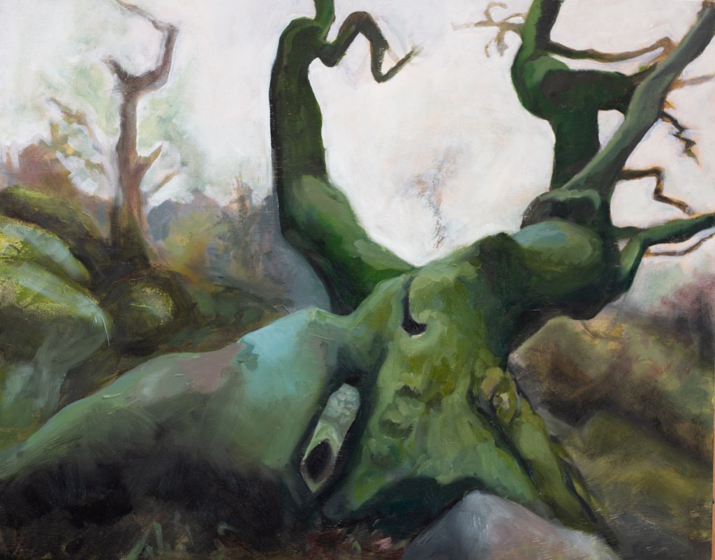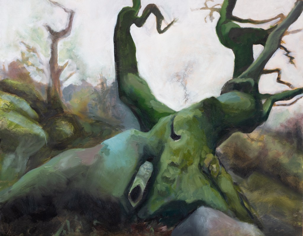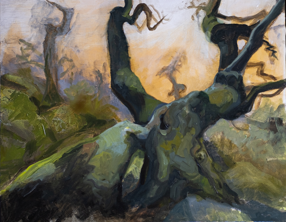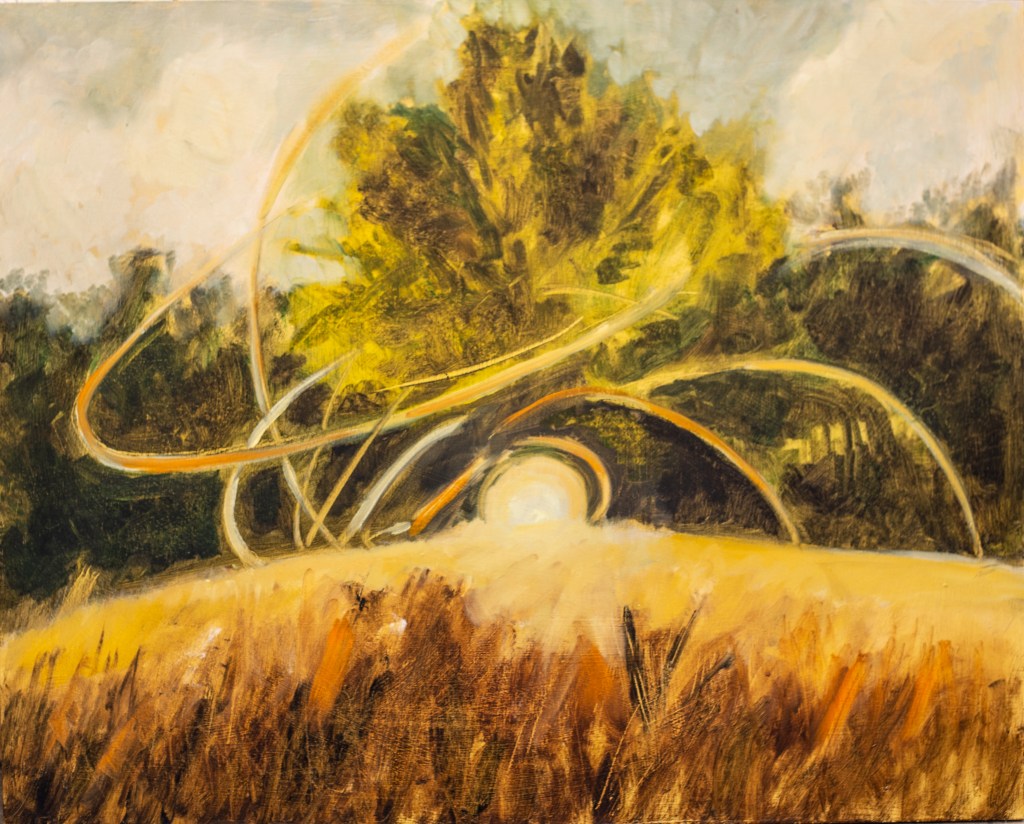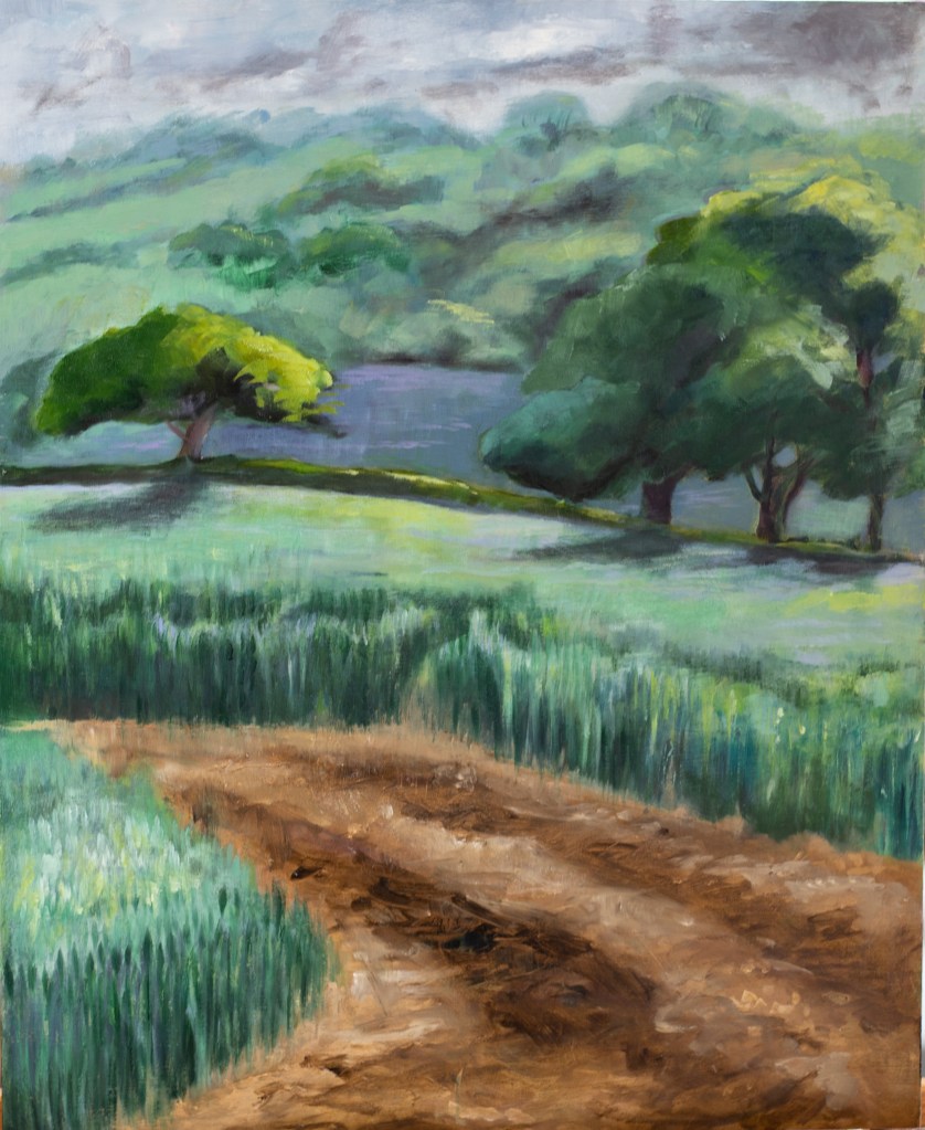 In preparation for an upcoming group shows, I’ve been revisiting some older landscape paintings – the show is entitled ‘Breath and Earth’ In this going back and revising, it seems to be all about the push and pull, some elements are now better, other elements have become worse with form and texture become flatter. I’m using this blog post to compare and evaluate the different versions. In addition, a new work has just been started with the aim of focusing on cornfields (as well as the twisting anthropomorphic trees cornfields are strongly related to folk horror).