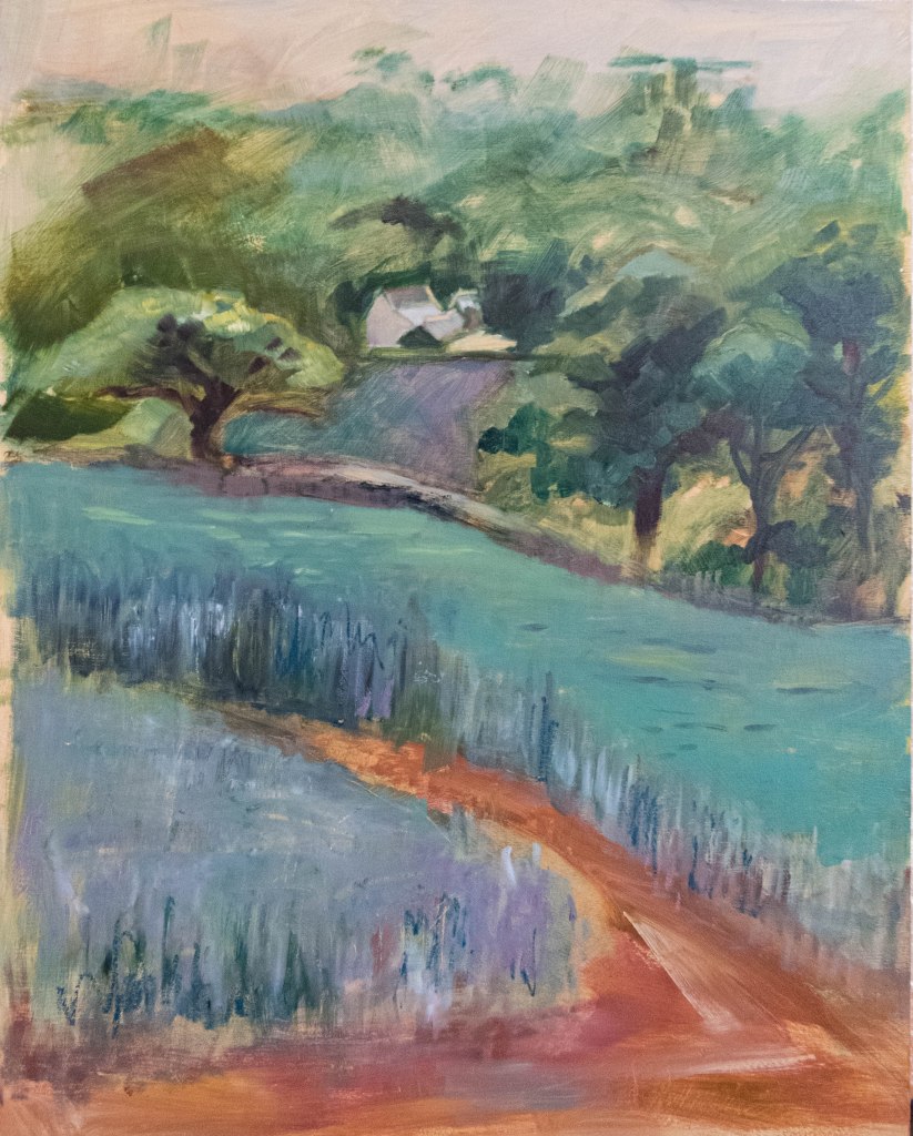 In the subsequent piece the spatial relationship are less precarious, the terrain while working better in conventional perspective is less interesting, and the colours tidied up – with the ochre of the track become less red and therefore less mysterious. The more worked up piece just hasn’t got the lightness of touch of the first. In putting on more paint things become less fugitive, more tangible, and solid.