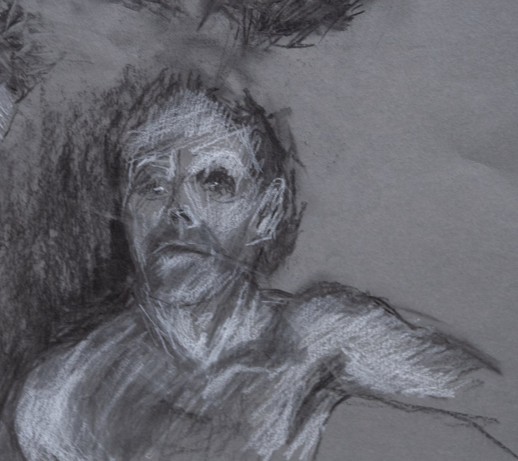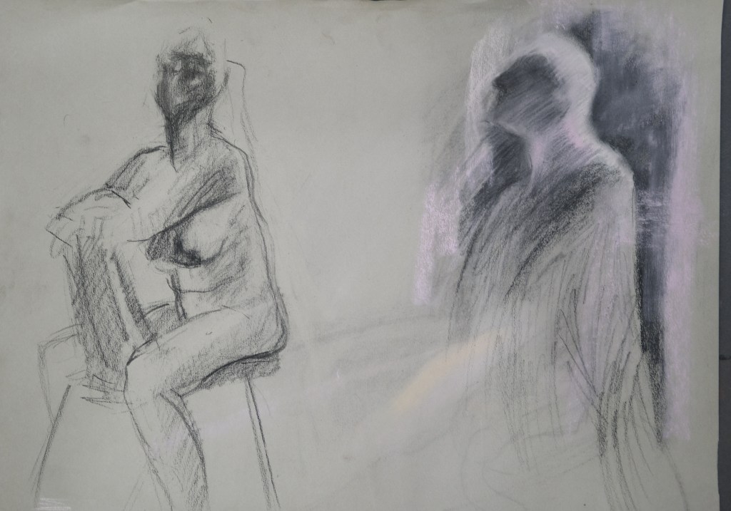 Couple of black and white drawings that I think show some progress with getting an interesting surface with the charcoal and chalk. Characterisation seemed interesting on one of these. Will take this learning to longer session on Saturday; working with the whole space in mind (and some colour)