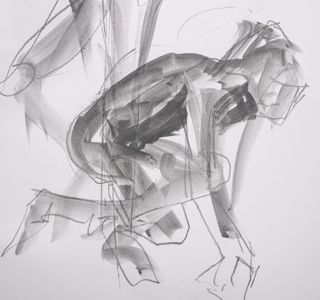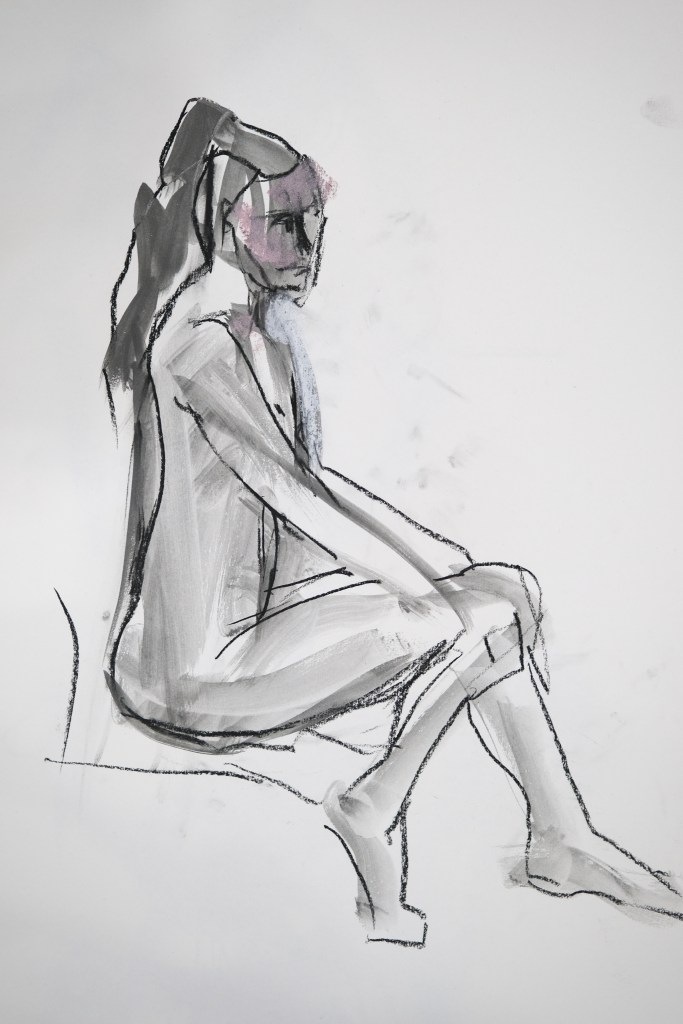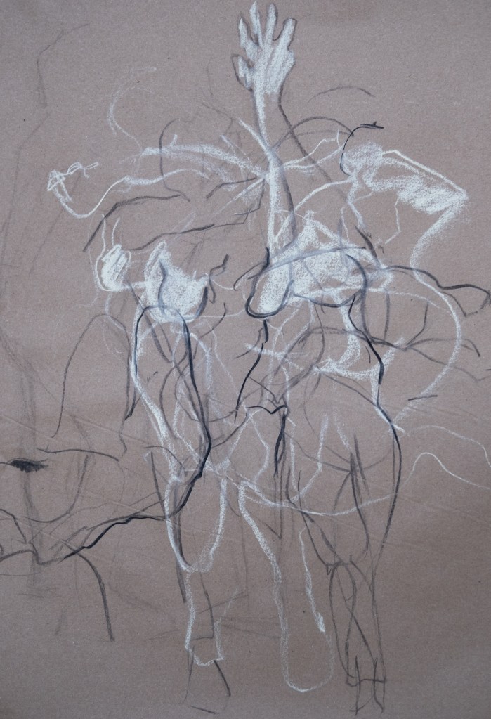 My main focus was on tone in this session. sticking to simple light dark and mid provided by the paper. Extending what I did last session I added some whites and worked on some black paper. I made a lot of ‘process’ drawings that were rubbed back. I rarely work back into Life Room drawings – somehow they are of their moment, but perhaps this would be one way to make more of the time spent in the life room. As I’ve got quite a bit of time booked this month a wider plan would be helpful in justifying the time/money. Needs more thought however. What did I learn skill wise? focus on hips. shoulders configuration to help plot the rest of the body & plant the feet first (as Tim Shaw had recommended – sculpture has to be planted on th earth to stand up – we have to be planted in the earth if we aren’t to make ourselves extinct!).