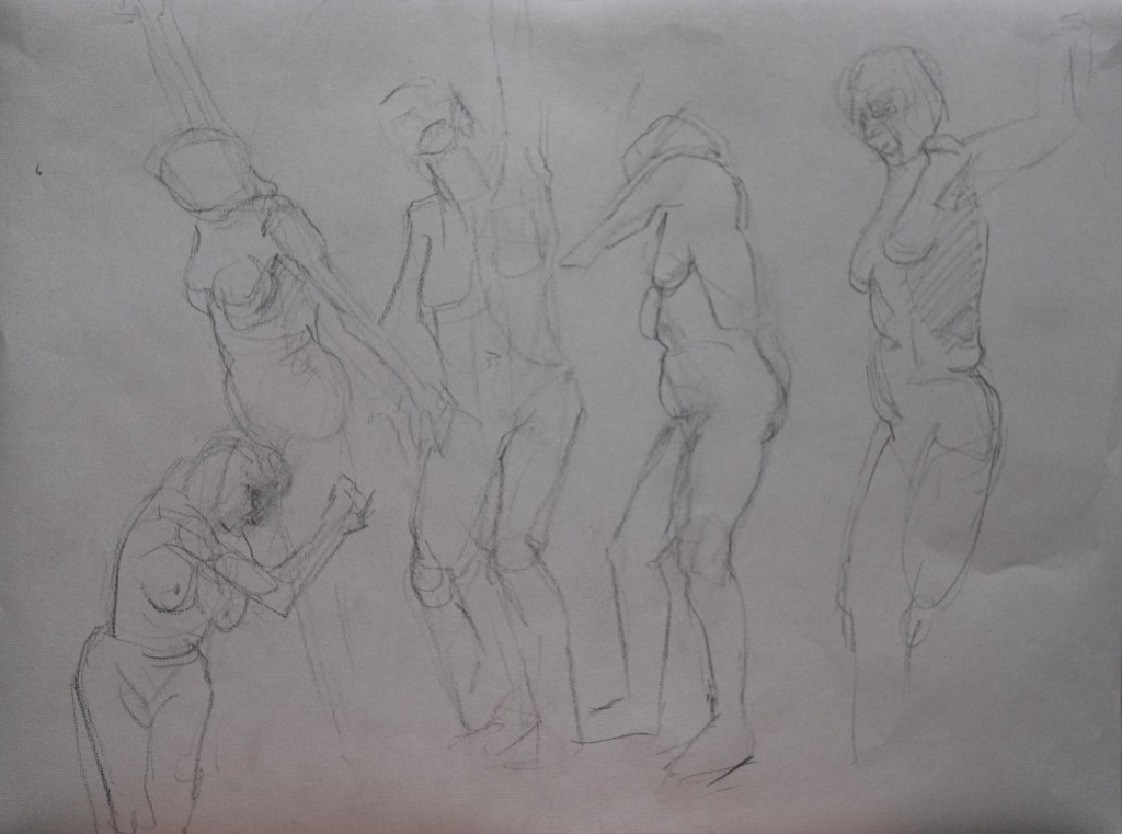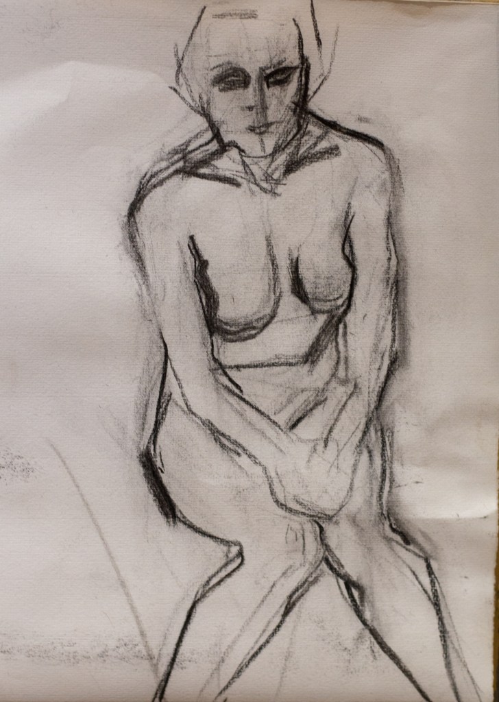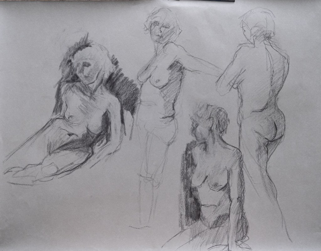 drawings from 17/12/22 – back to charcoal fundamentals, pleased with positioning of the figure in the last one. Some problems with proportions in one or the early one, top right.