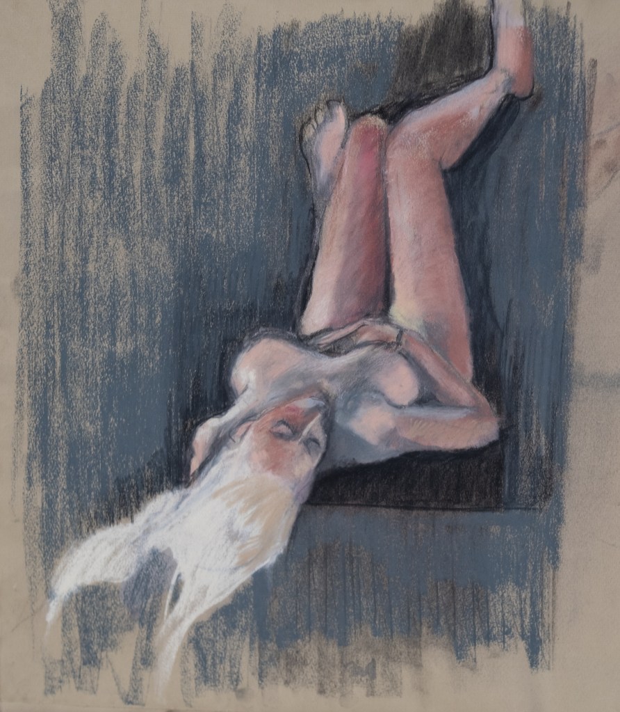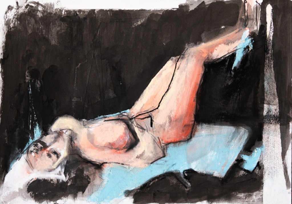 Very much freer in my approach than usual. Liquid graphite for the two sitting poses. Keeping in mind the mark making as well as a more spare approach to putting down colour as well as keeping to a limited palette. Last image is large – warms and cools playing of each other and I like the dashes around the fringe of the cushion, a foil to the softness of the tone on the body; modelling could be better now that I see a small version of the piece.