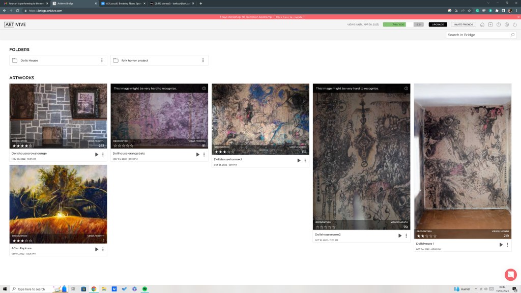 Preparations for the Tremenheere show continue apace. I worked with one of the artists this week to get their stuff onto artivive. I’m starting to formulate an idea around how to better help 2D artists into thinking spatially so that working with AR would prove easier for them when working rather blind. A toolkit might be a good plan for this – with examples, videos and a list of differences to be born in mind – perhaps a little 3D moving model to demonstrate perspective change in 360. This might be a project that could be funded. Just now lots of dull admin to do to get the event on Eventbrite and to finish off the app before launch date. Last artist’s work was scanned last week so hopefully, that will be in-app in the next week or so. Lots of tidying to do with the screens yet and the big decision from Neil (who owns the sculpture garden that we are making the app for) about the title of the app – he’s gone for ‘The Mystery of Art’ – personally I’d have preferred Invisible Garden but he has his reasons and working collaborative and within a co-design paradigm means decolonizing the decision-making process. Meanwhile, prep to do for a conference on immersive happening thi month at Falmouth, industry facing, where I will talk about the creative potential of AR. I’ll post the salient points when they are more solid in my mind.